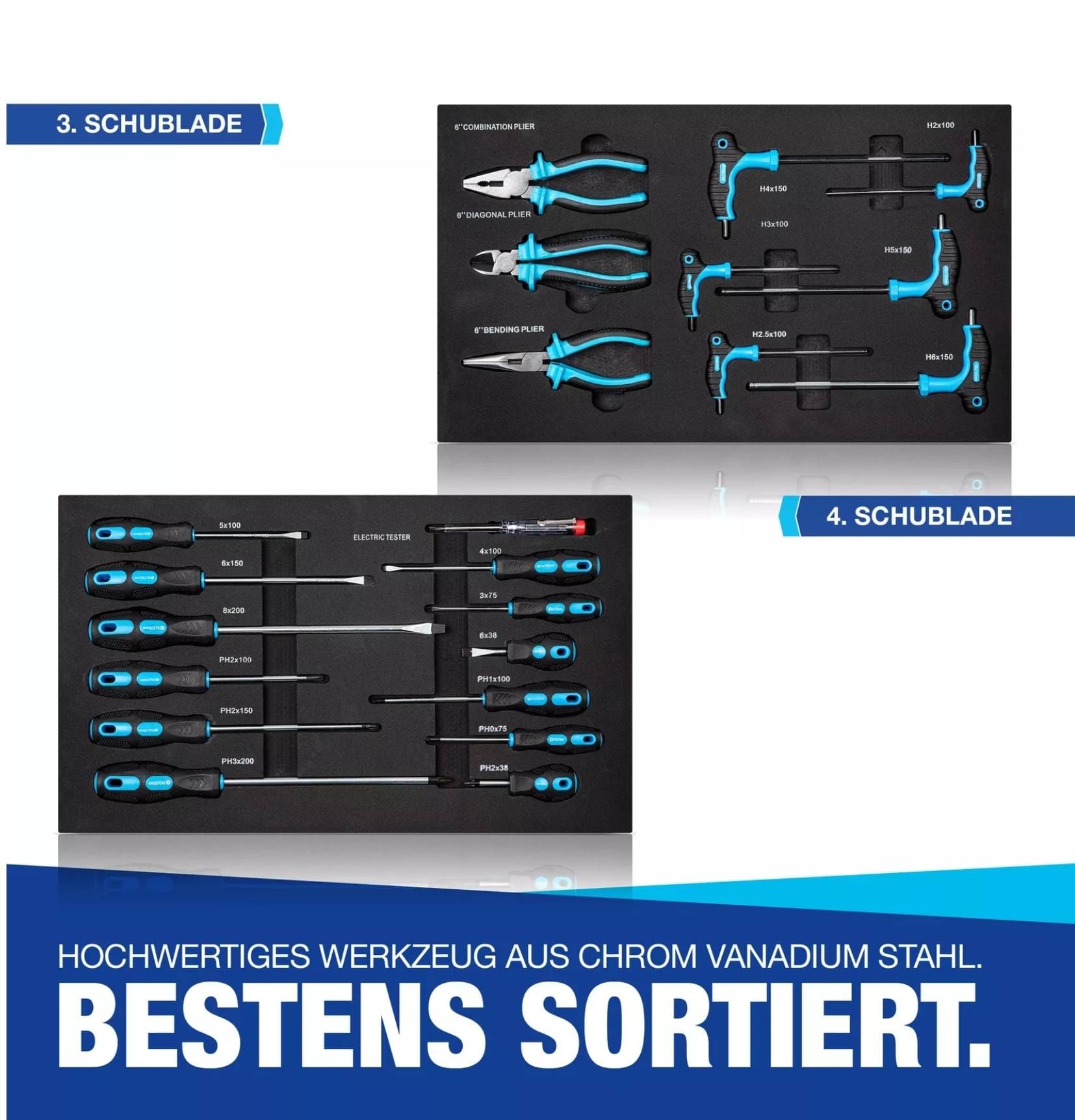Η εργαλειοθήκη διαθέτει πλήρες σετ εργαλείων για καθημερινή χρήση, όπως κατσαβίδια, κλειδιά, πένσες, σφυρί, μετροταινία και άλλα απαραίτητα.
